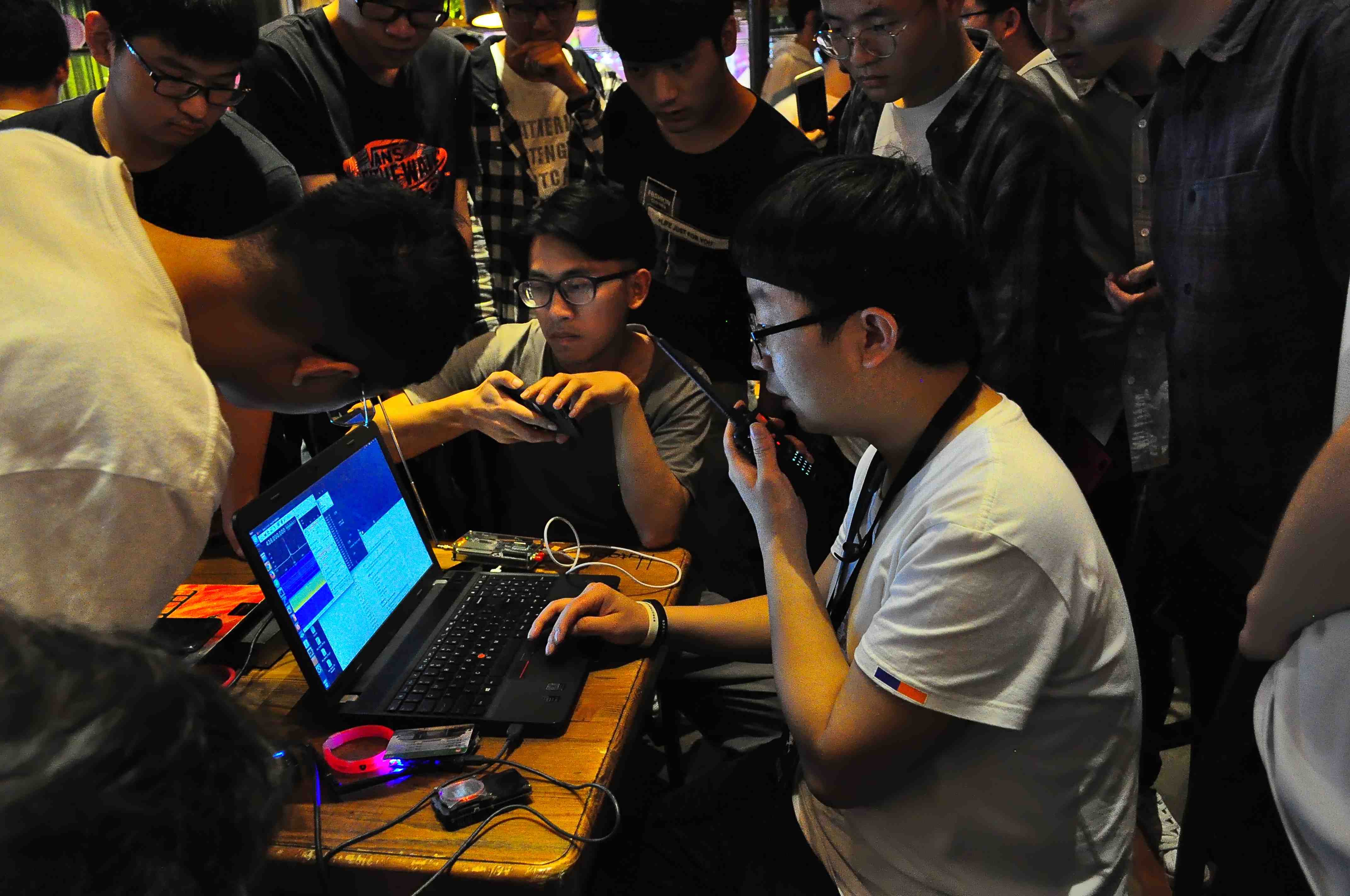 最后,自由炫技的Village show来了。此环节由360 UNICORN GROUP独角兽核心伙伴冰尘、永不消逝的电波(代号)和数智安全实验室(原伏宸安全实验室)同时进行。前者通过剖析电子通讯,展示通讯安全中存在的漏洞,带来《频段监听》《GSM HACKING》。后者带来《智能锁具破解演示》,进行WIFI攻击演示和黑客硬件打造,零基础亲手打造了一个网络流量工具和RFID频率识别卡片。现场以炫技者为中心,自然形成360度人群环绕,极客们炙热而真诚的眼神透露出他们对黑客领域的热爱。